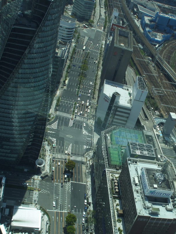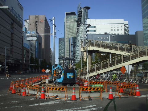 | 2015年04月11日。ミッド展望台から。画像下の錦通の交差点下で90°カーブしている 地下鉄東山線上の地下街から分岐して画像上、名駅通右側のビルの並びの途切 れた先まで作られるようだ。 |