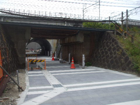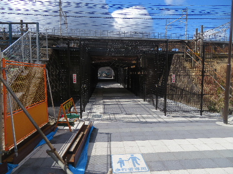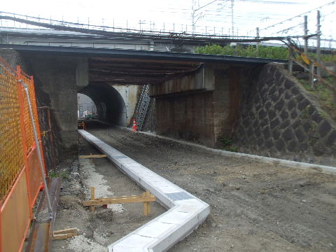 2021年08月07日。線路下で歩道つくりが行われている。 線路をくぐった後、新幹線の高架橋に沿って南へつなが るようだ。その左の名鉄の築堤と道路の間の狭い空地が 柵で仕切られているがここに地下道の出入口が作られ そうな気がする。 |