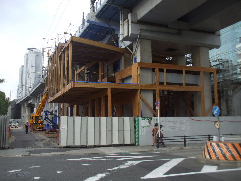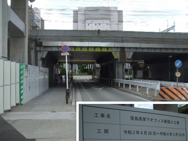 2021年08月07日。架道橋脇の新幹線の高架下に会社の オフィスが作られるようだ。歩道を歩いてきた人には殆ど 関係ないがただの高架橋よりは殺風景さが和らぐか。 |