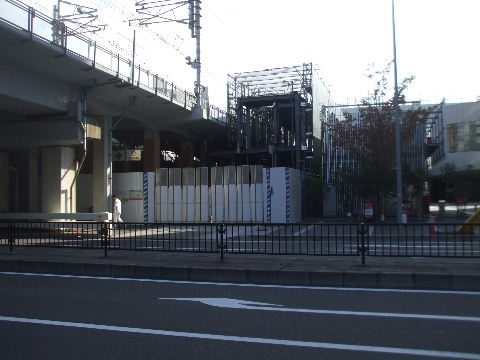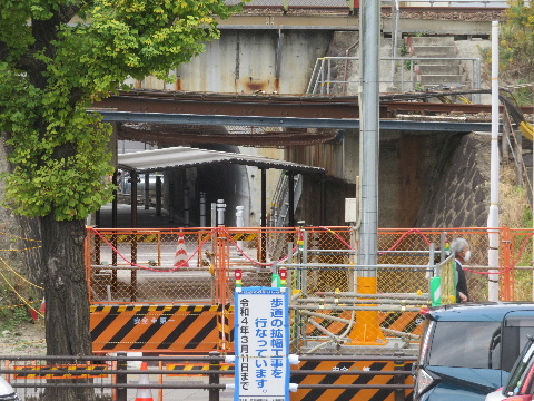 | 2021年11月07日。新幹線の高架より少し高い鉄骨組み中。 | 2021年11月07日。下広井町交差点。整備中の架道橋の 向かい側で歩道を広げる工事中。 |