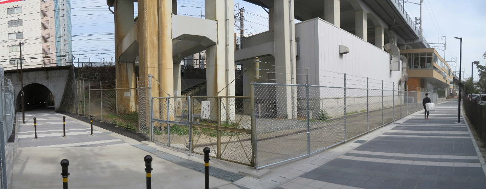 | 2021年08月07日。下広井町交差点のすぐ南に柵で 仕切られて使われていない古い架道橋があったが ここら辺が地下道の出入口になり架道橋下がその 続きの歩道になるようだ。 |