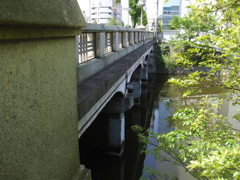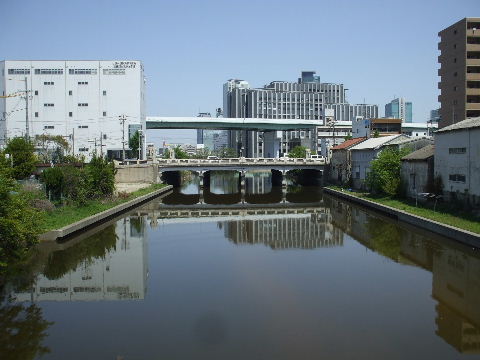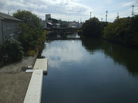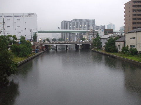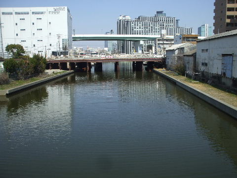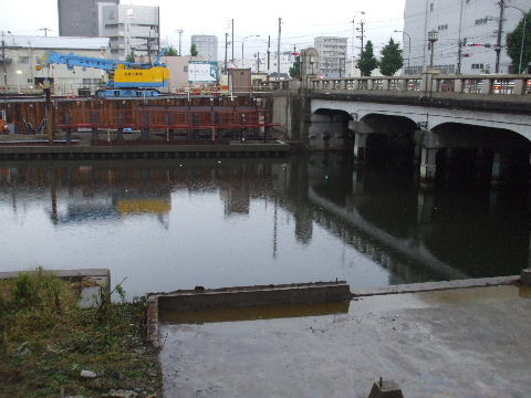 2012年04月28日。一つ下流の猿子(えんこ)橋から見る。ここは護 岸が新しくなっている。ささしまライブの船溜や下流の露橋下水処 理場の工事が進んだらここに笹島と結ぶ遊歩道でも作られそうな 感じ。 |