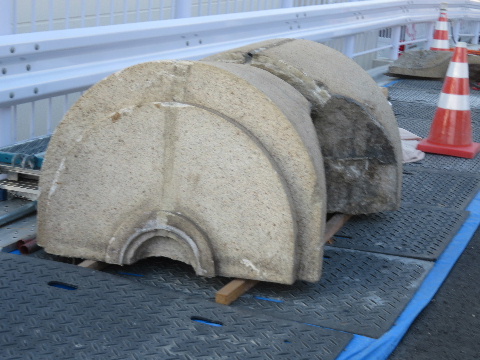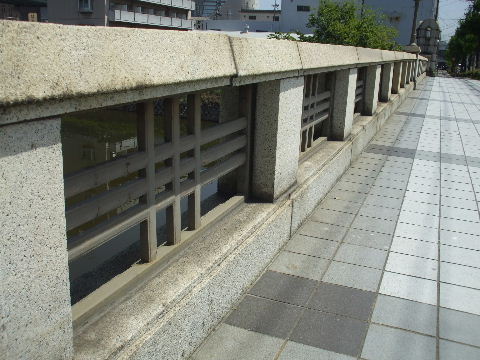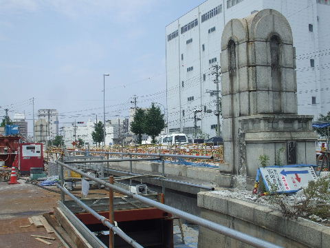 2013年07月28日。今の橋の下流側歩道部分を撤去しているようだ。 欄間もなくなっている。東から。 |