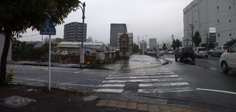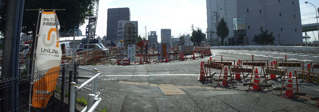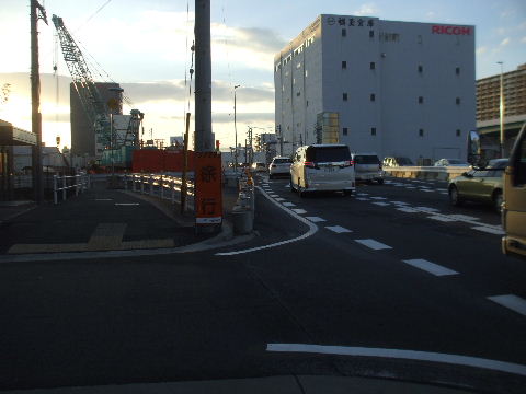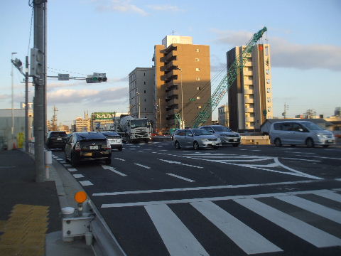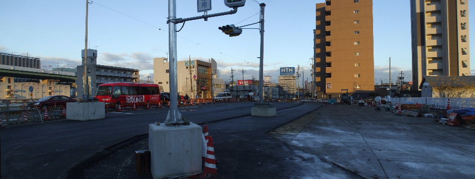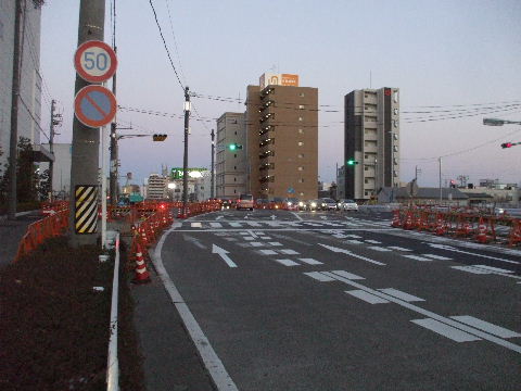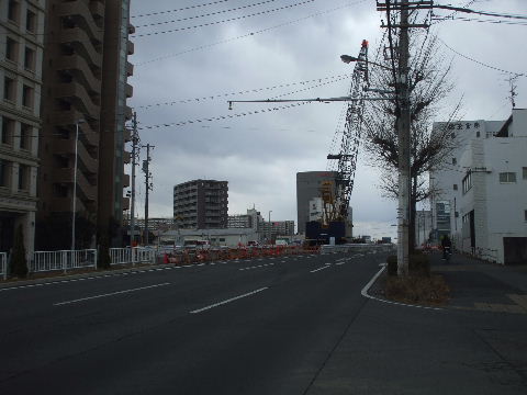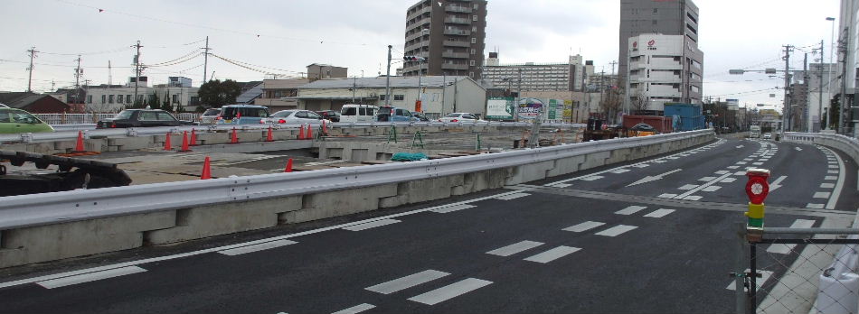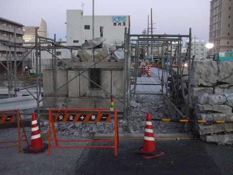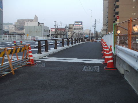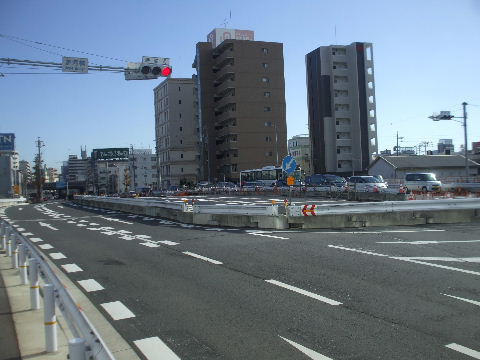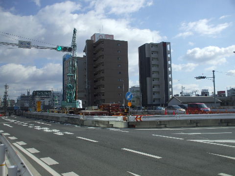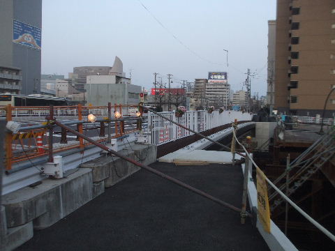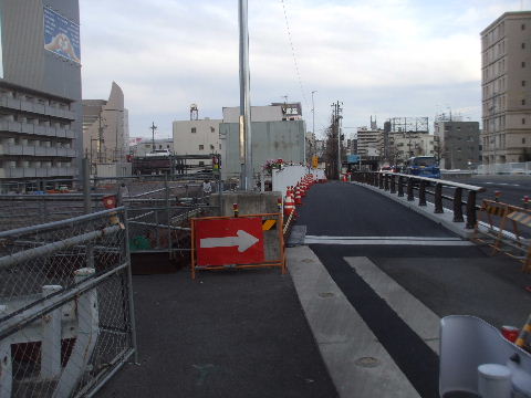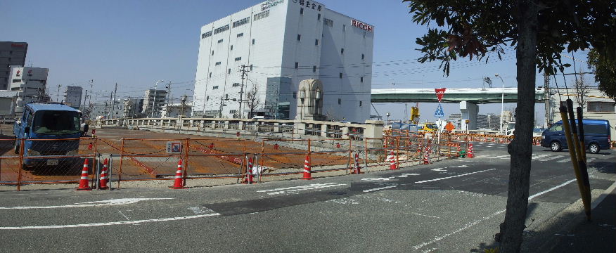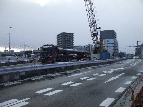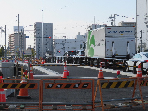 2013年03月16日。前後の中央分離帯も撤去されておりこれから道路を仮橋方向にカーブさせる工事が行われる。右すぐ角 にビルが建っていてちょっと窮屈な感じ。 |