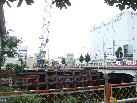 | 2012年06月16日。橋袂の倉庫が撤去され仮橋工事が始まっている。 |
