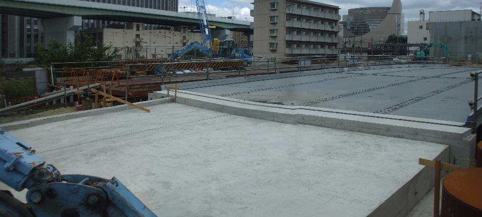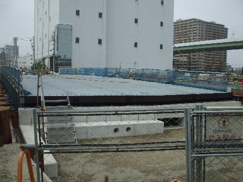 2012年06月16日。西岸から鉄骨組みが始まっている。手前は倉 庫の床跡。 |