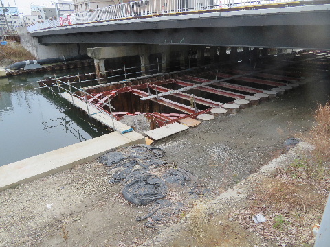 2012年04月28日。西から見る。奥が六反交差点方向。右、下流側 に仮橋が架けられる。 |