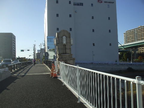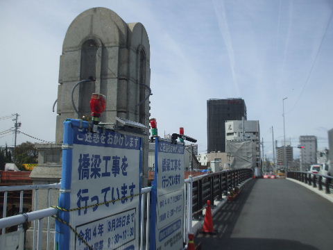 2022年03月21日。下流側やっと欄干がつきそして何と 旧橋の親柱が復活。 |