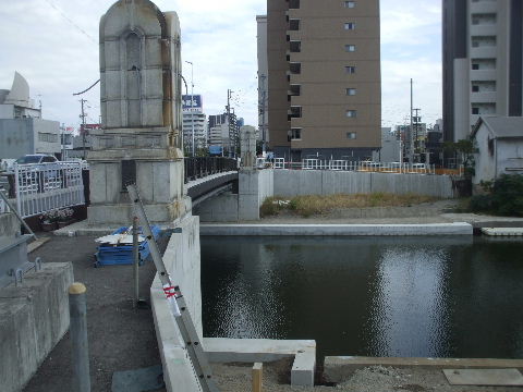 2023年05月28日。上流西側の親柱だけまだない。 橋の袂から船溜への岸壁整備中でこれと一緒に 整備されるようだ。 |