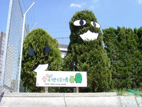 これが作り方としては一番簡単なものだろう。それらしい形の植込みの木に顔のパーツをつければ出来上がる。左は名古屋市役所西庁舎前の植込みのモリゾー・キッコロで7〜8体ならんでいた。中には目が片方とれて無くなっているのもあって面白い。右は名古屋市東区の鍋屋上野浄水場の入口にあるものでしぼんでやせてしまったのに喜んでいるモリゾーと熔接用サングラスを掛けているようなキッコロ。