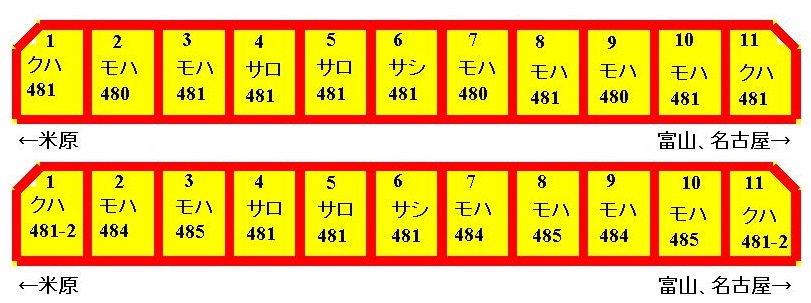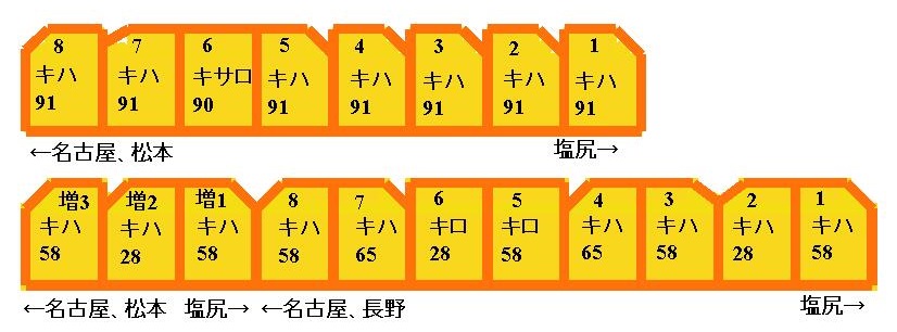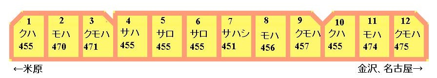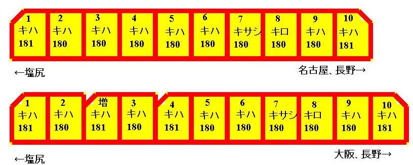 少し昔名古屋駅で見た列車の編成表 1970年代に名古屋駅に出入りしていた列車のとある日の編成表です。 1972年4月2日特急「金星」「しらさぎ」 1972年4月2日特急「しらさぎ」1973年3月4日「しらさぎ」 1972年4月2日特急「しなの」 1972年3月28日特急「白鳥」これのみ米原駅 1972年4月2日特急「くろしお」 1972年4月2日特急「ひだ」 1972年4月2日急行「比叡」 1973年3月4日急行「兼六」 1972年4月2日急行「桜島」「高千穂」 1972年4月2日急行「阿蘇」 1972年4月2日急行「きそ」 1972年4月2日急行「大社」1〜5号車は金沢ー鳥取、米子間運転。敦賀で併結。 1972年4月2日急行「赤倉」 1972年4月2日急行「紀州」 1972年4月2日急行「のりくら」 1972年4月2日快速「近江路」 1972年4月2日普通 東海道線 1972年4月2日普通 東海道線 1972年4月2日普通 東海道線 1972年4月2日普通 東海道線 1972年4月2日普通 東海道線 1972年4月2日普通 中央線 1972年4月2日普通 関西線