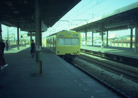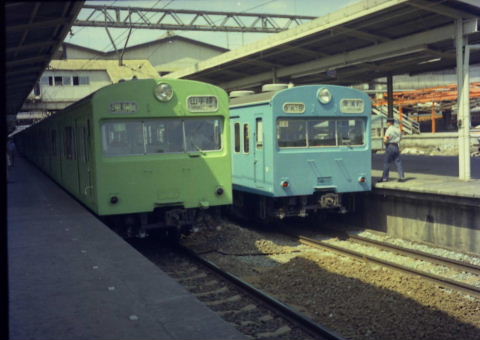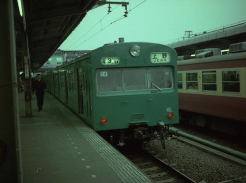 | 山手線と京浜東北線の103系電車。1973年品川駅。
