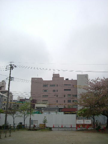 ビル全身画像をスライドショー形式で見る。| 2006年4月15日。奥の白い塀が現場で 西から見る。南向いの公園から見てい る。 |