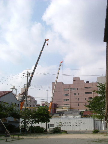 | 2006年8月26日。クレーン車が3台入っ ている。一台は右影にある。もうそろそろ 始まりそうかな |