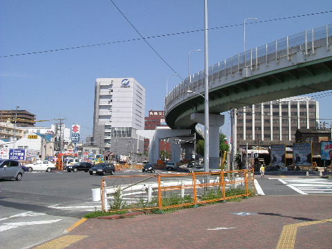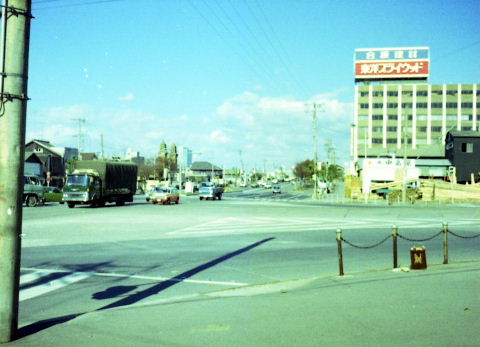 ? 1974年 名古屋市中川区の山王橋交差点を南側から見る。まだ高速道路が無くビルもあまり無いので広々していて奥に松重閘門が見えている。今の写真に虎柵が見えているので判るようにまた高速道路を作る工事が始まっているので2〜3年後にはまた景色が変わる。