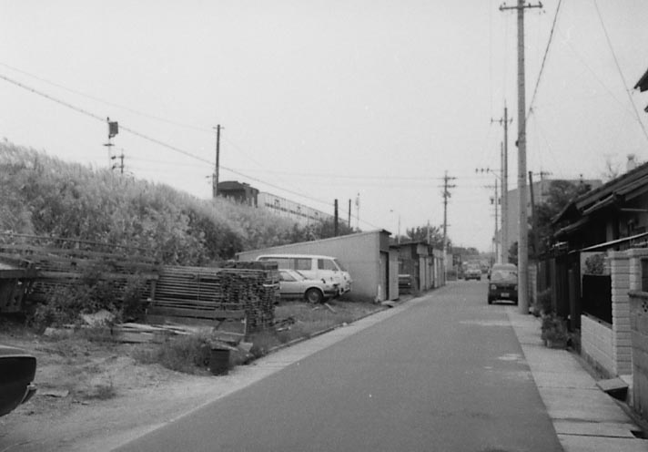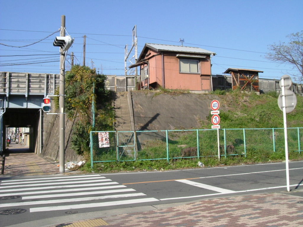 2 幡野町地内。このあたりの土手では今でも春先になると土筆(つくし)を採る人が見られる。土手を上がると臨港線との間が三角形の草っ原で、子供の遊び場にもなっていた。JRになってからフェンスが張られて入る人が殆どいなくなった為、所々に自然に出来ていた登り道も草に覆われて無くなってしまった。今は築堤が途切れた所にビルが建っている。この先の築堤は廃止後すべて撤去された。