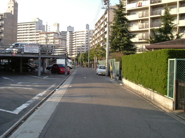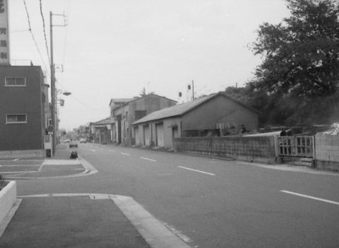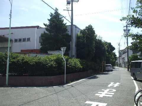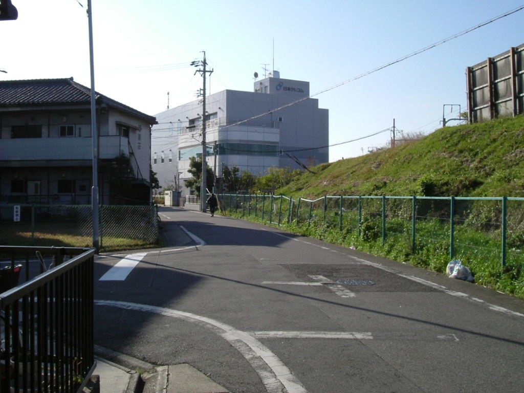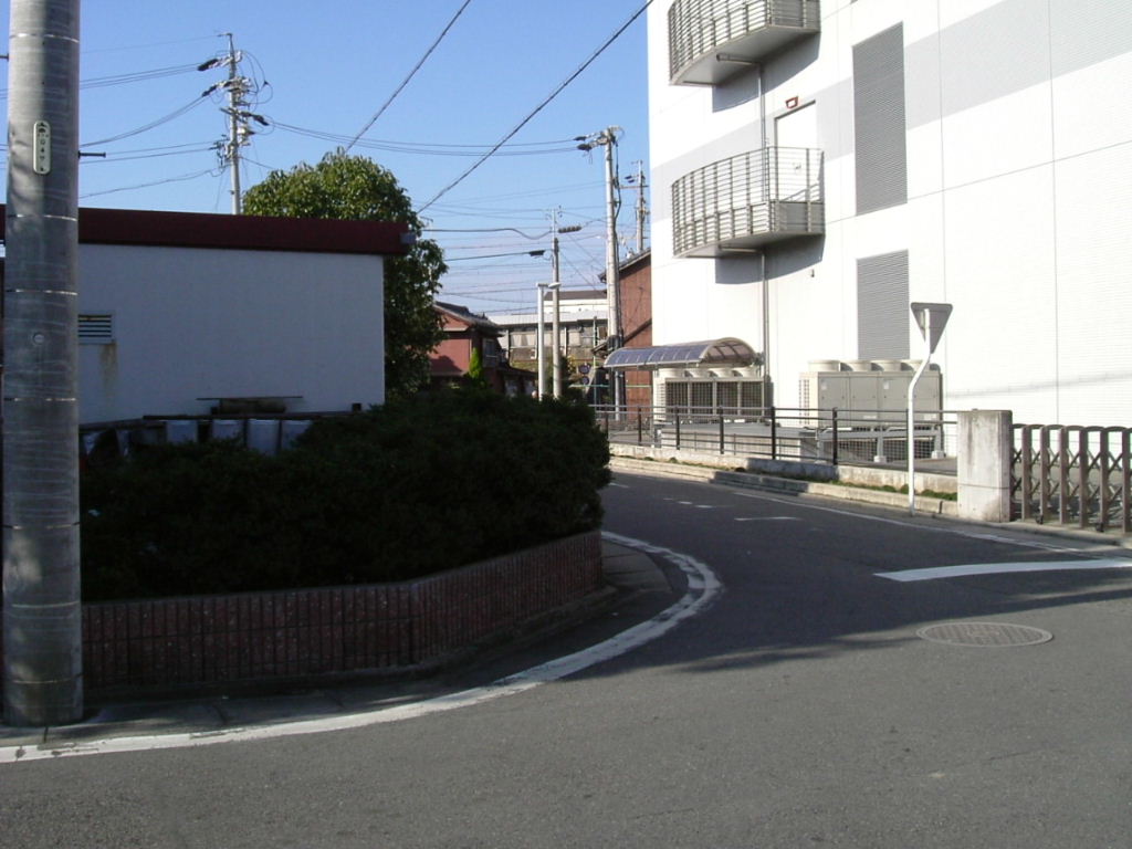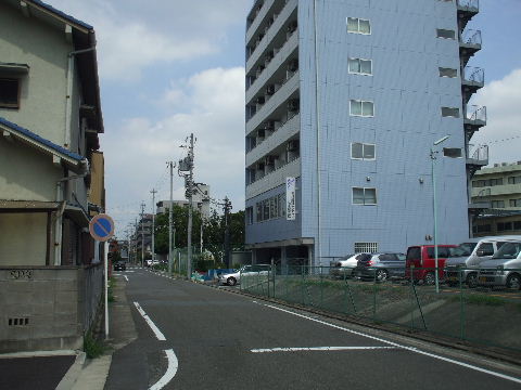 5 切戸町地内。4のトンネルの切戸町側から八幡信号場方向を見る。築堤を撤去した跡にビル。左の建物は今も残っている。