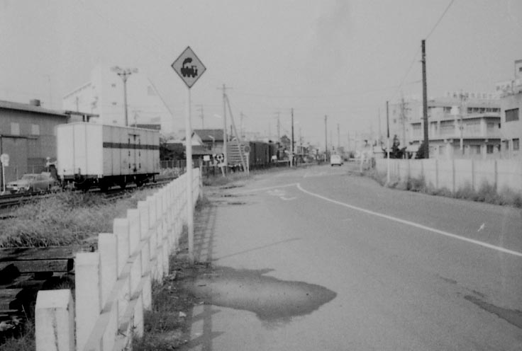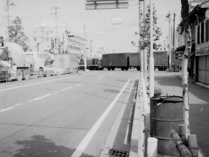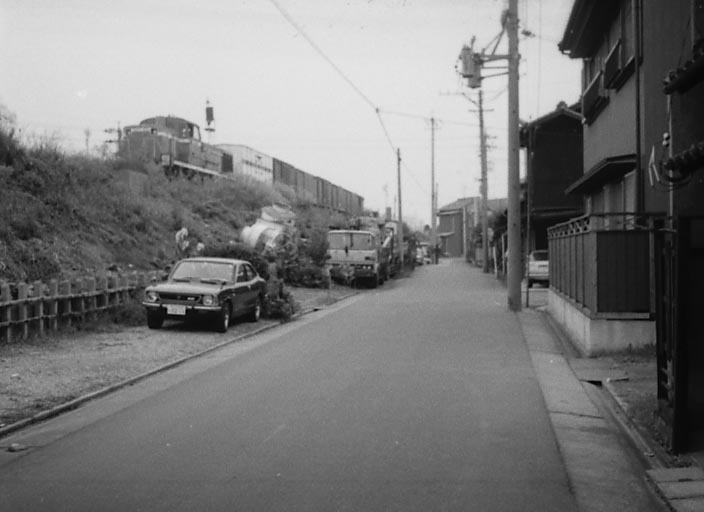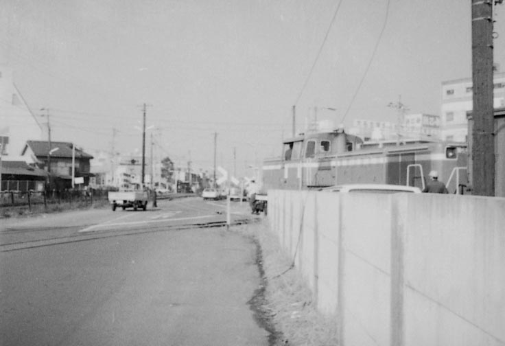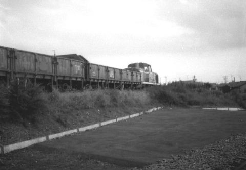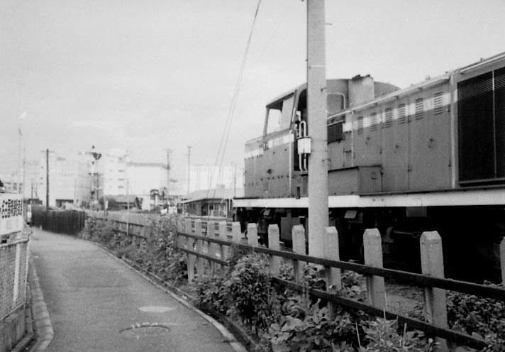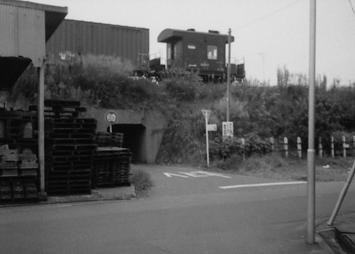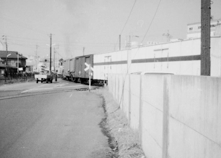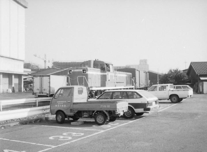 19 この四枚は連続で、市場駅からの貨車の引き出し。名古屋市場駅として独立していた頃は線路とホームがもっと奥まで延びていた。縮小して空いた所に貨物を奪ったトラック等の駐車場が出来た。この列車が通っている線路と交差して手前から右へ入っていく線路の先には冷蔵品を積み降ろしするホームがある。