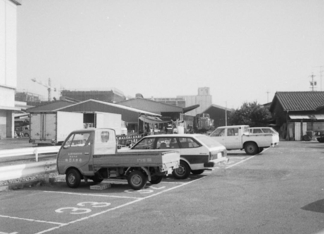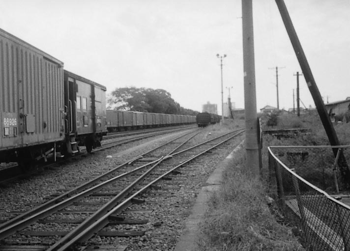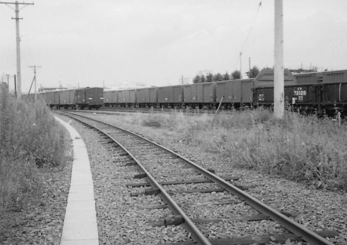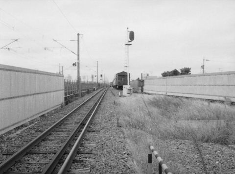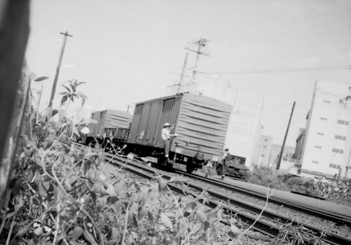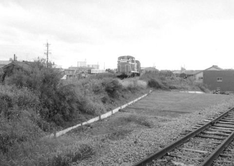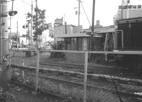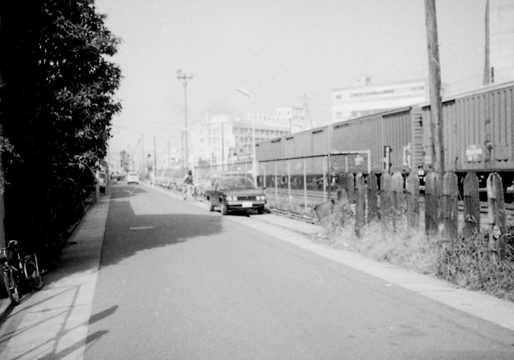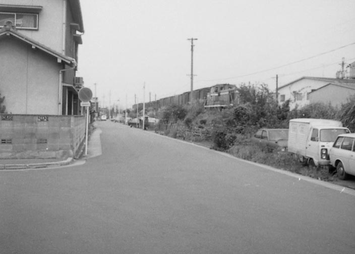19 この四枚は連続で、市場駅からの貨車の引き出し。名古屋市場駅として独立していた頃は線路とホームがもっと奥まで延びていた。縮小して空いた所に貨物を奪ったトラック等の駐車場が出来た。この列車が通っている線路と交差して手前から右へ入っていく線路の先には冷蔵品を積み降ろしするホームがある。