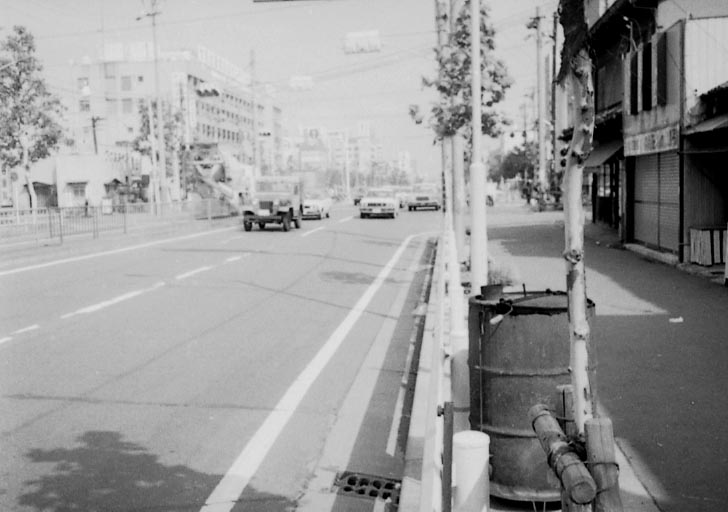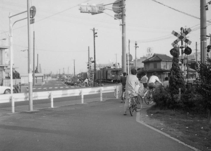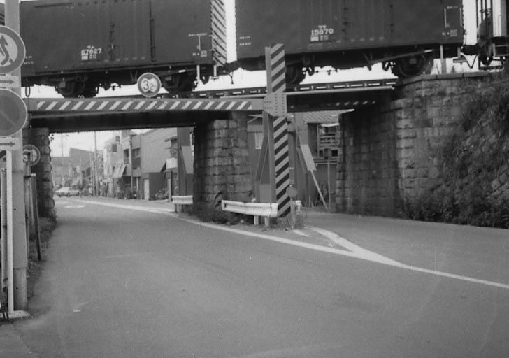 9 江川通。北から南を見る。機関車や貨車の大きさと比べると下の狭さ、低さが判る。歩道もここだけ作られなかった。これを市バスがギリギリでくぐり抜けて行った。鉄橋の橋脚が道路中央でなく少し右(西)へ寄っているのは1960年代前半まで左(東)を用水(江川)が流れていたのでその位置に合わせて立てたためと思われる(今はこの道路の下で暗渠になっている)。線路跡地にはマンションが建った。