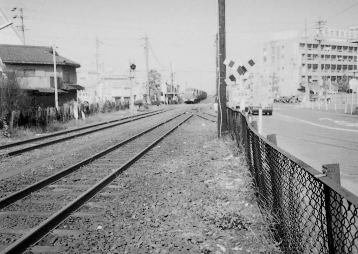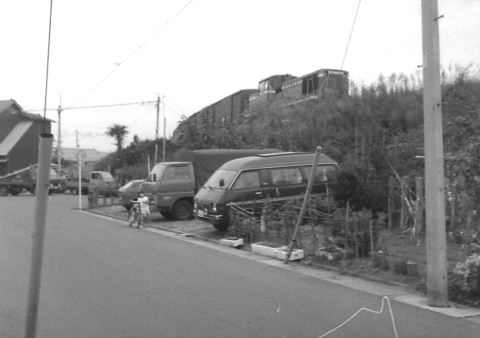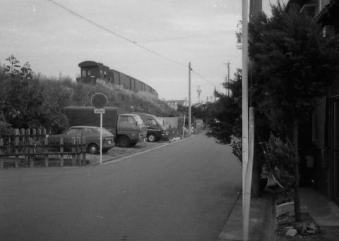 3 幡野町地内。下の道路を子供が駆けて競争できる位のゆっくりとしたスピードで線路を軋ませながらカーブを走って来る。写真2のビルを反対側から見る位置。