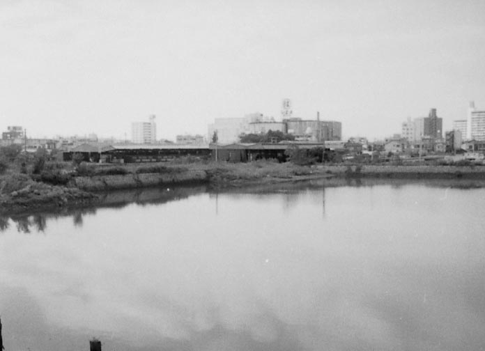 21 堀川の土手から見る貯木池にも既に木材の姿はない。全く別の場所のようであるが大体同じ方向を見ている筈である。ただし、同じ角度だと土手しか写らないので少し上を見ると国際会議場がある。相当土を盛った事が判る。