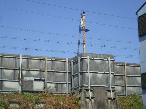 0 臨港線から白鳥線が分岐する八幡信号場手前の場内信号機。臨港線用と白鳥線用の2機ついているのが見えるがいまは当然臨港線用1機だけ。建物が建って同じ方向からは見えないので横から。信号設置用に築堤が横へ出っ張り新幹線用の防音壁もそれに合わせた形に取り付けられている。