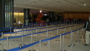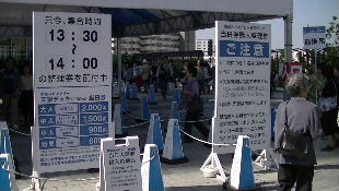 入場券売り場前の行列用柵には殆んど人は並んでいない。当然外の行列用テントはからっ ぽだった。 |