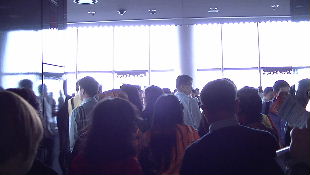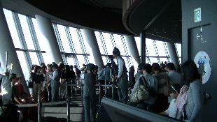 エレベーターで上から降りてくると着くのは345mのフロアで、時間が経ってこの混雑。窓辺 に寄るには人が動くのを待つしかない。 |