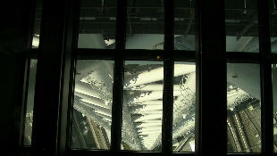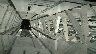 エレベーター天井窓から下へ降りていく鉄骨が見える。 |