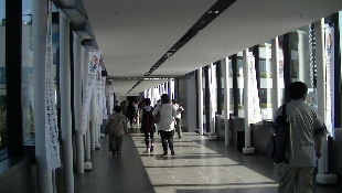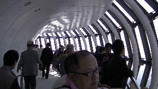 緩いスロープを外を見ながら少しずつあがっていく。この程度の人数で窓辺にもすぐ寄れ る。 |