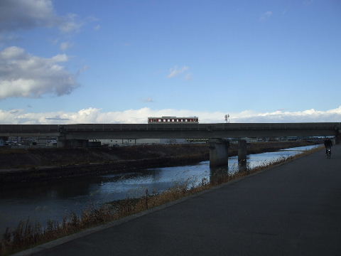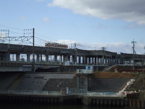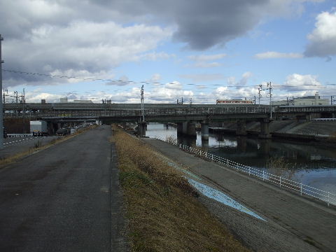 | 2012年01月23日。東海道線、稲沢線を跨ぐための高架を登りながら新川を渡る。下流側から見ているので手前が新
