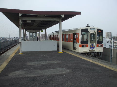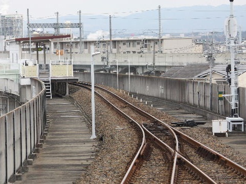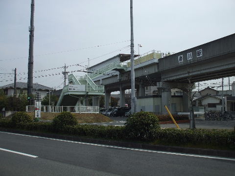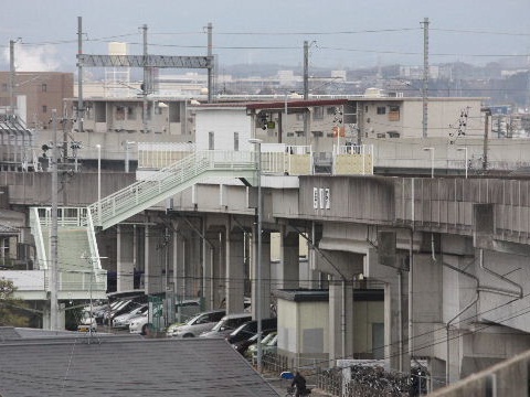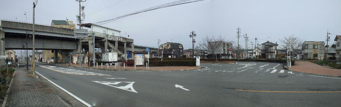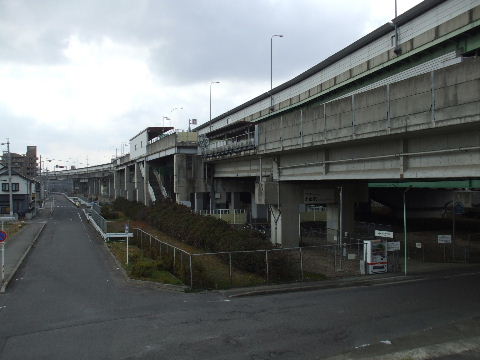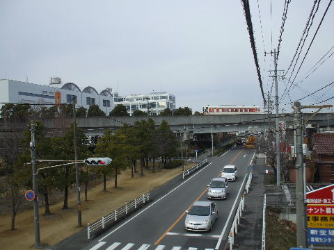 | 2012年01月28日。駅の少し東で名鉄小牧線を跨ぐため高架橋が高くなっているので折り返してもう1階あがる。
