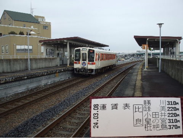 | 2012年01月14日。高速道路と並んで暫く走ると比良駅が近づいてくる。 |