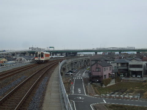 | 2012年01月14日。さらに高速道路とぴったりくっついて進むと前方に味美駅が見えてくる。 |