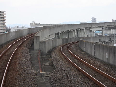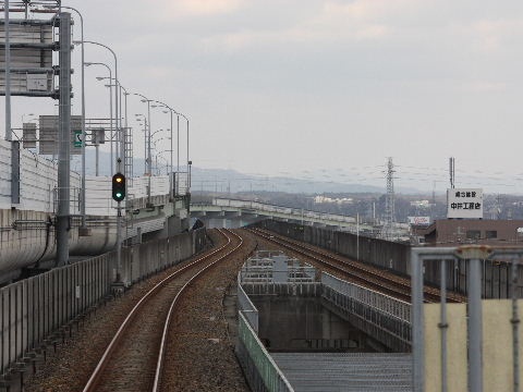 | 2012年01月14日。国道22号線を過ぎると高架橋が二手に分かれ、勝川方面の線が高くなっていく。 |