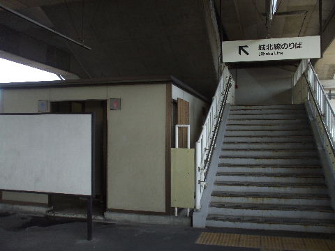 | 2012年01月23日。階段を上がり踊り場で折り返してやっとホームに辿り着く。ホーム下のこの階にトイレがある。