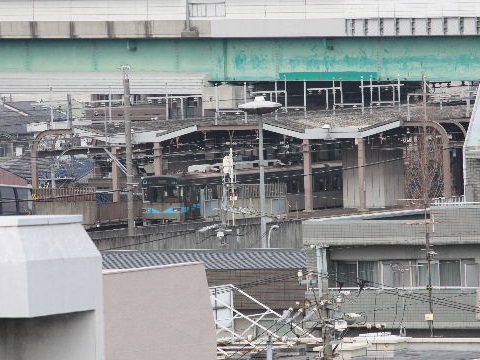 | 2012年01月23日。ホームから北を見る。すぐ前の白いビルの左側奥、高速道路の下に名鉄・地下鉄上小田井駅があ