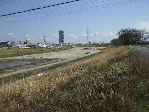 | 2012年3月25日。新川洗い堰。奥、突き当たりが庄内川堤防で左端、草の生えていない所が少し低くここから庄内川