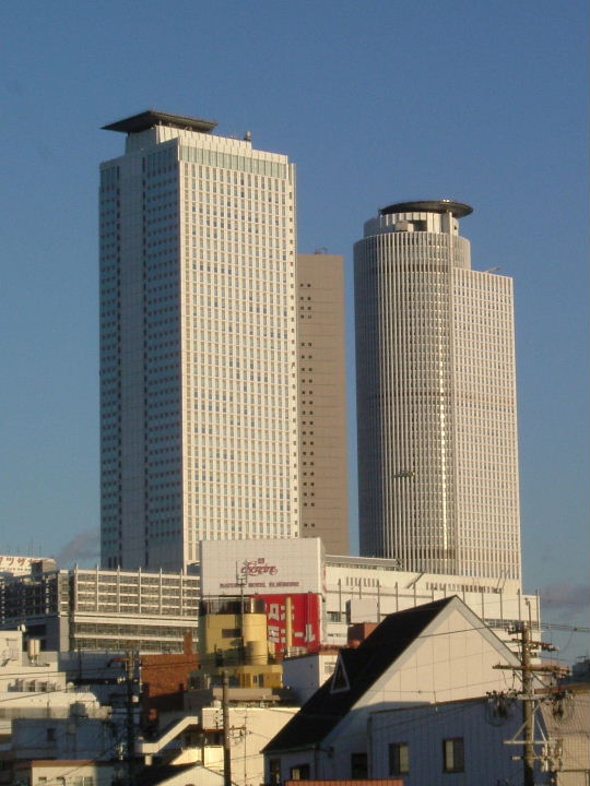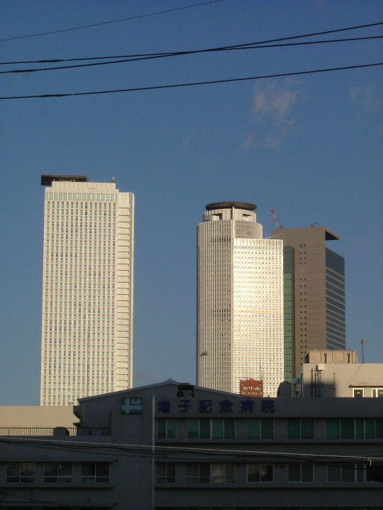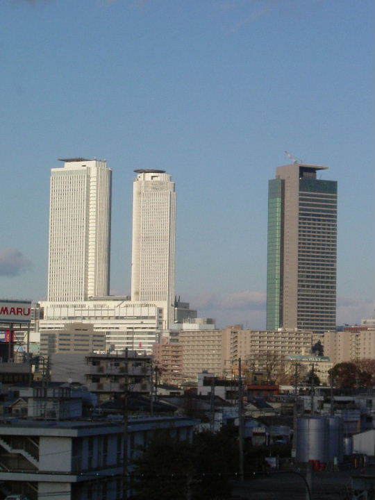 則武本通3の駅西銀座入口からだとタワーズ.......................................則武本通2ではタワーズの間に見えている。 ホテル棟に重なってしまう。 本陣通2まで来るとタワーズの左に見える。.......................................これは東枇杷島駅近くの庄内川堤防から。