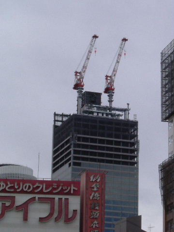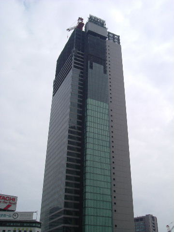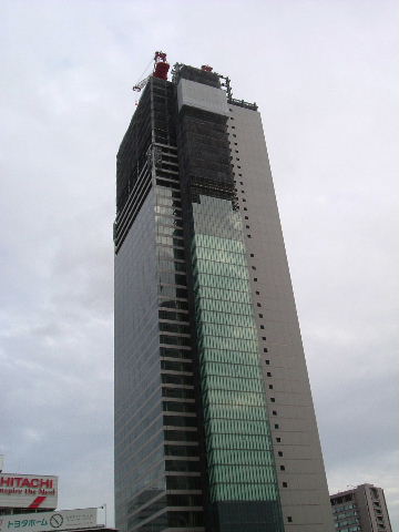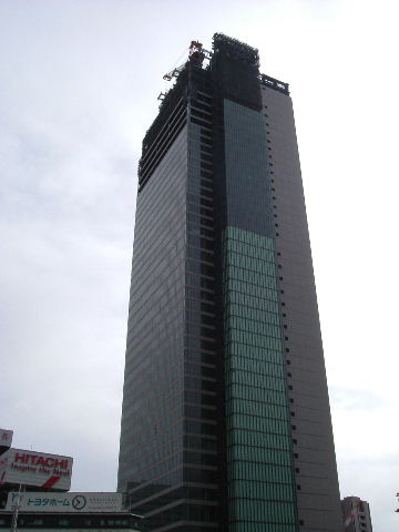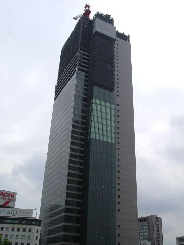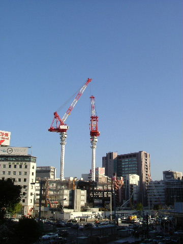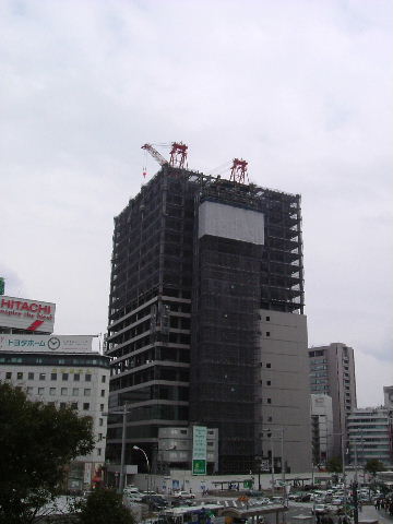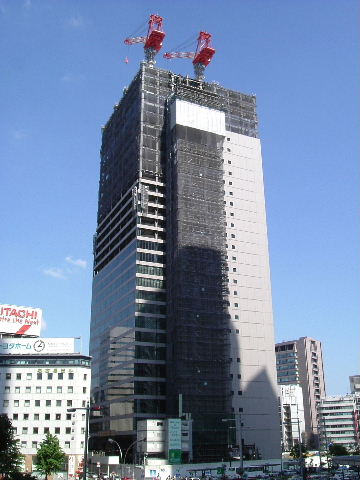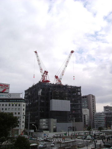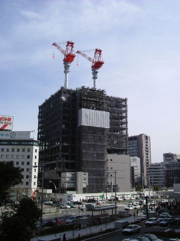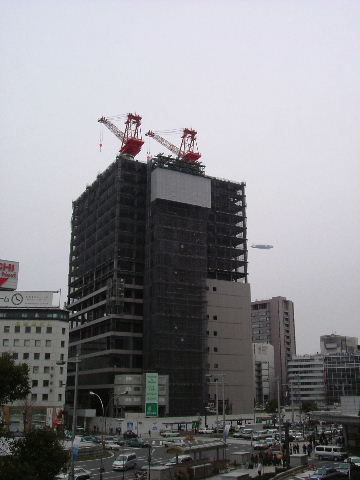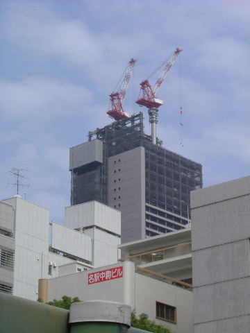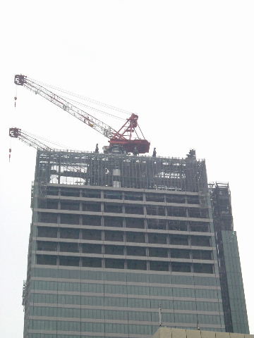| 2005年10月16日。下からではよく判らな いので離れた所から見てみると鉄骨の一 番高い所がタワーズより高くなっているよ うに見える |