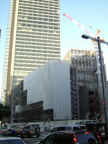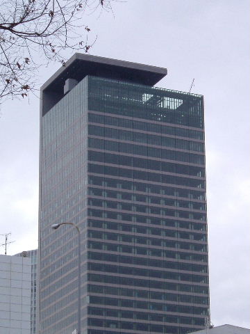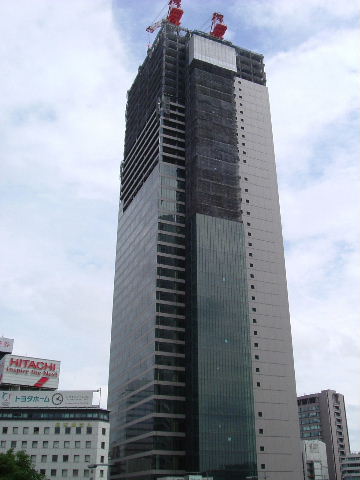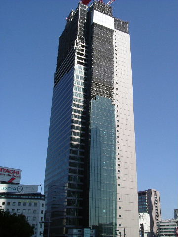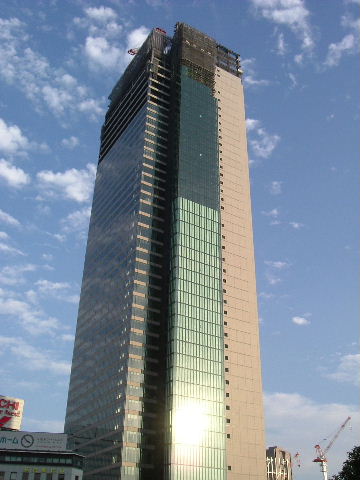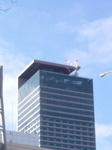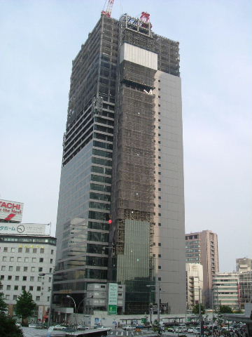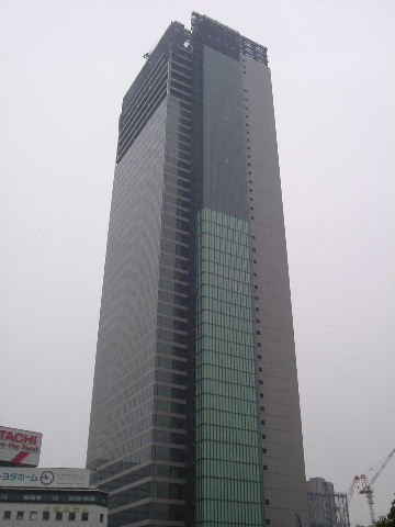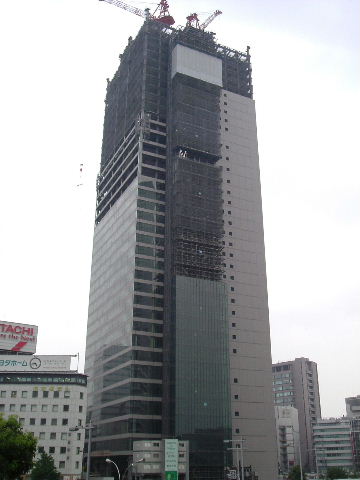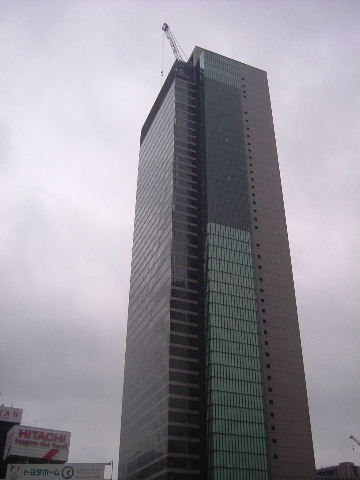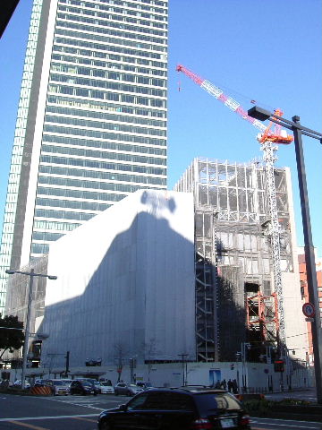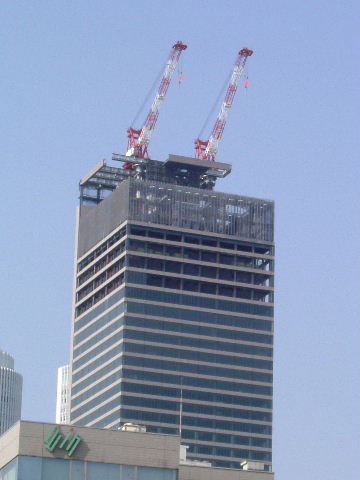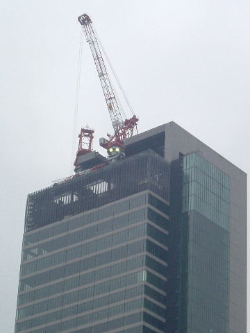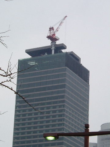 2005年12月4日。骨組み、外装終了間 近。低層棟が敷地いっぱいにまで広が り、超高層ビルにつきものの公開空地と いう場所は余りなさそう。白いカバーの 掛ったエスカレーターと思われる物が置 かれているのが見える。 |