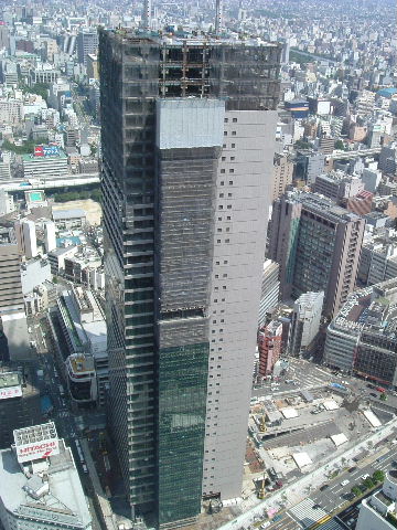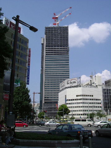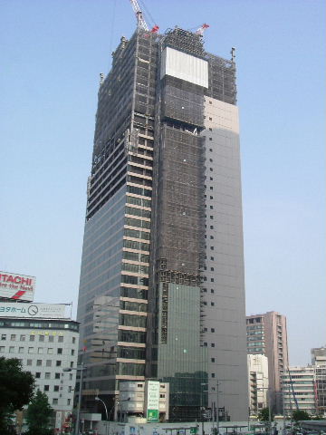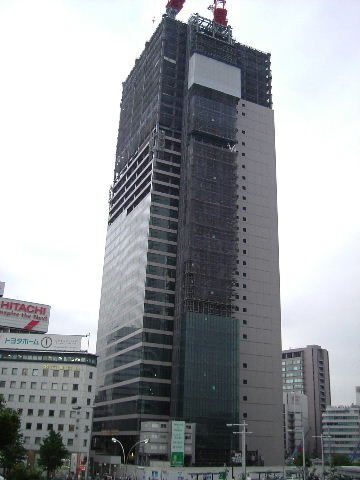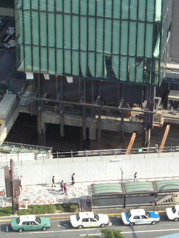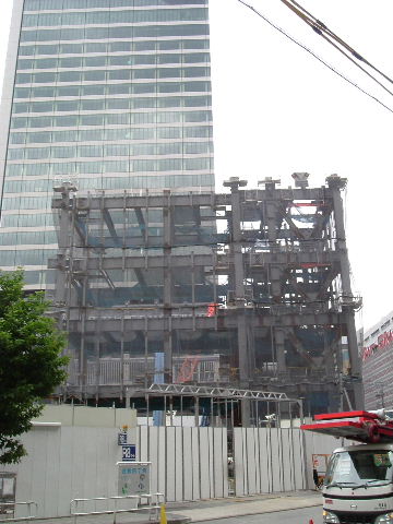 | 2006年7月8日。西側、超高層棟の正面 も大分出来てきた感じ。二階建てエレベ ーターはまだ目隠ししたまま。 |