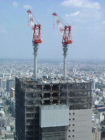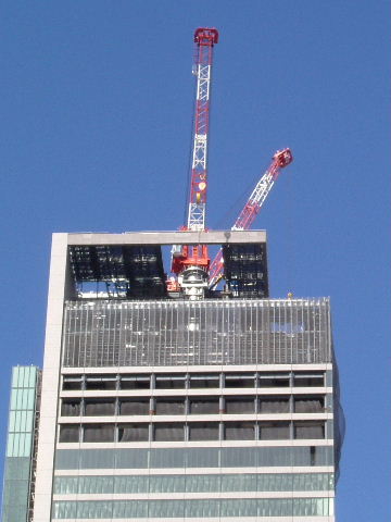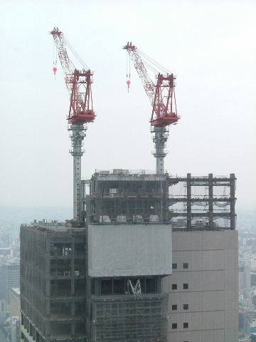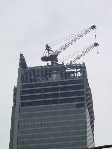 | 2005年9月23日。超高層棟最上階への 鉄骨の組み立てが進んでいる。 |
