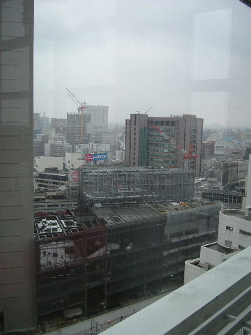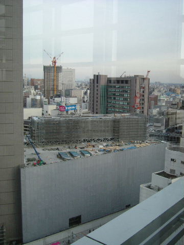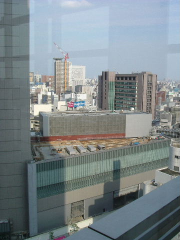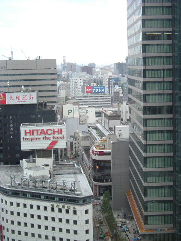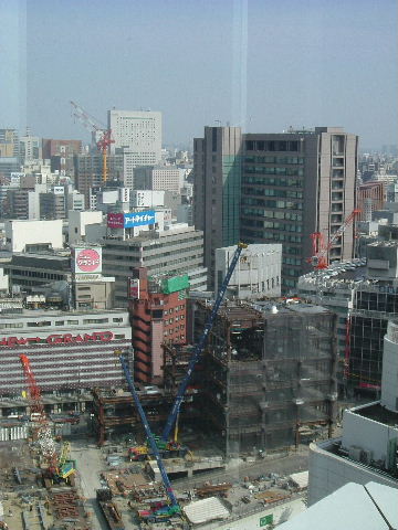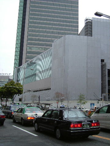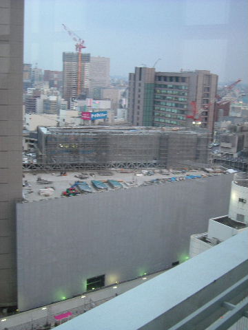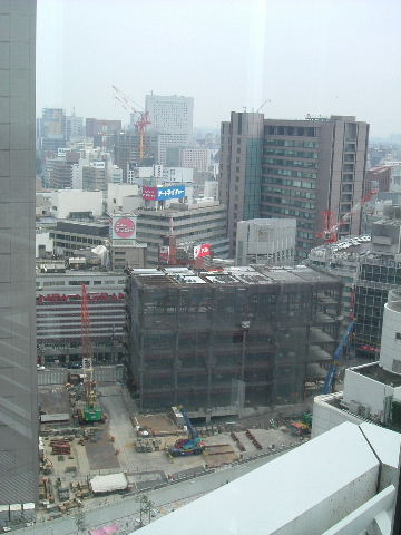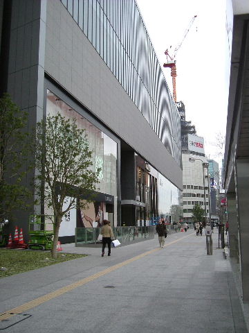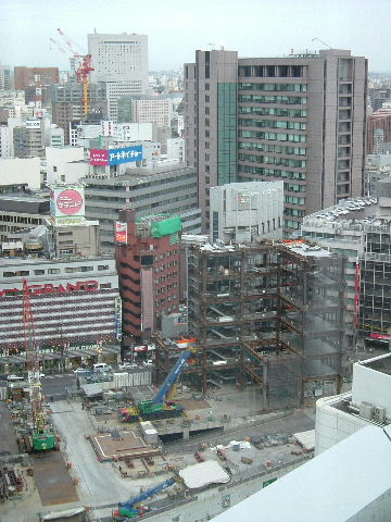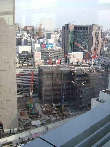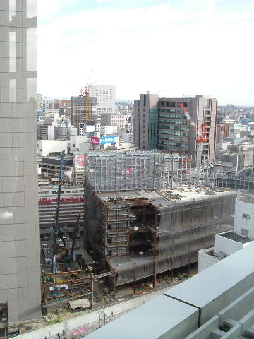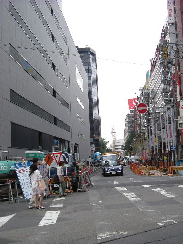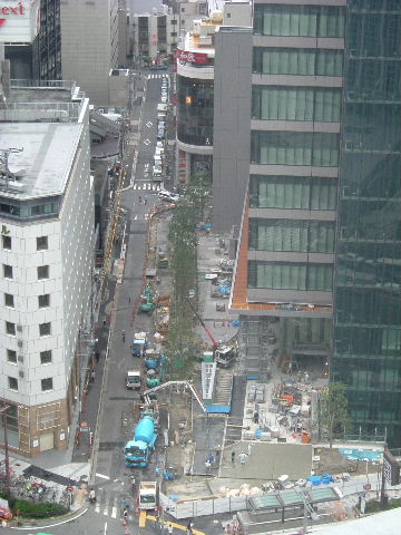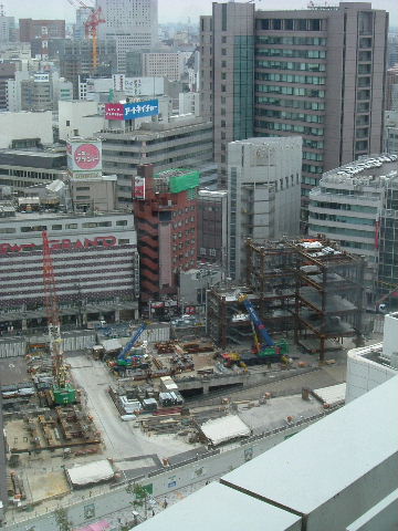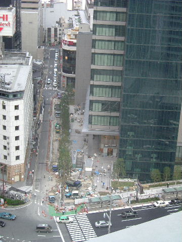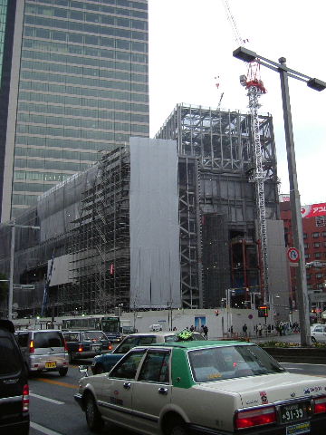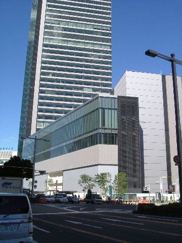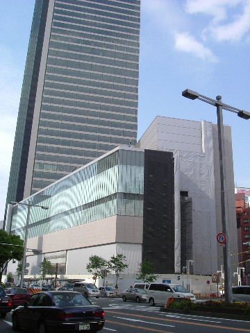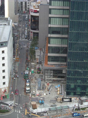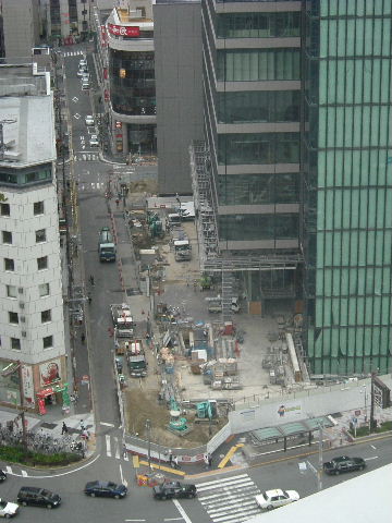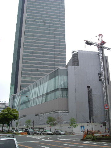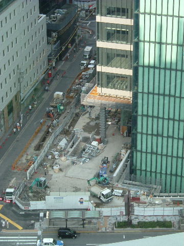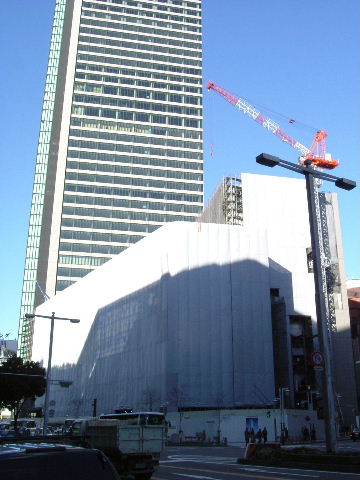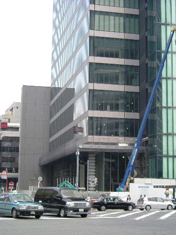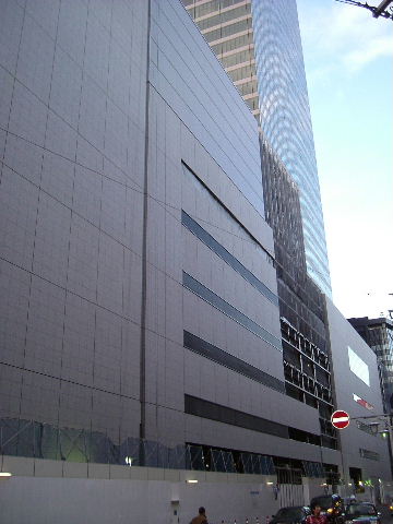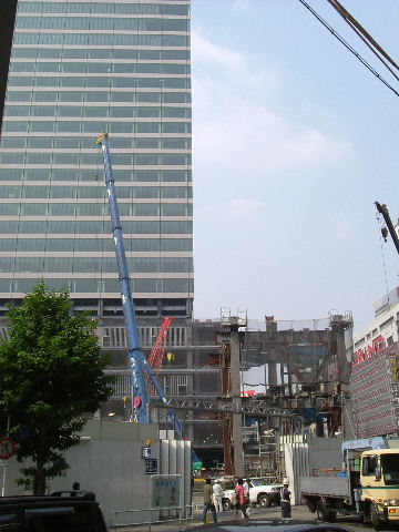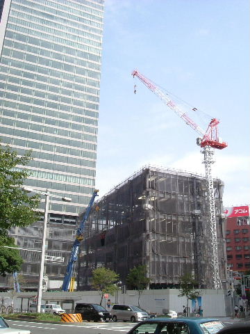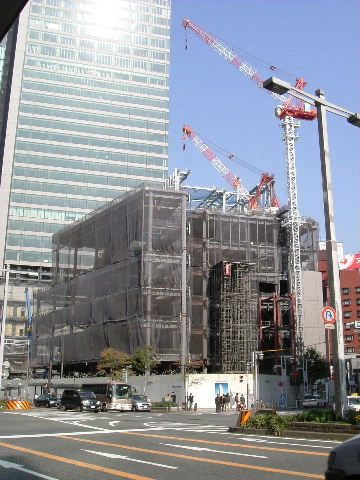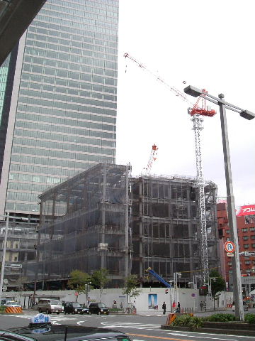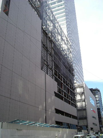 | 2006年9月9日。奥に見える中小企業セン タービルが段々出来上がってきた。建て替 えられ2階が通路で繋がる事になったよう だ。以前の毎日ビルとは地下で繋がり中経 ビル、第二豊田ビルまで行けたが今の所、 中経、第二豊田の地下は孤立している。 |