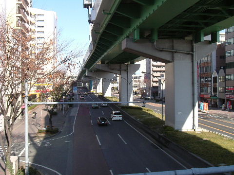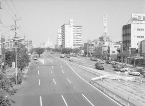 1979年。交差点の歩道橋から北を見ている。廃止になった市電の線路がまだ少し残っている。今はその跡に高速道路の橋脚が並ぶ。