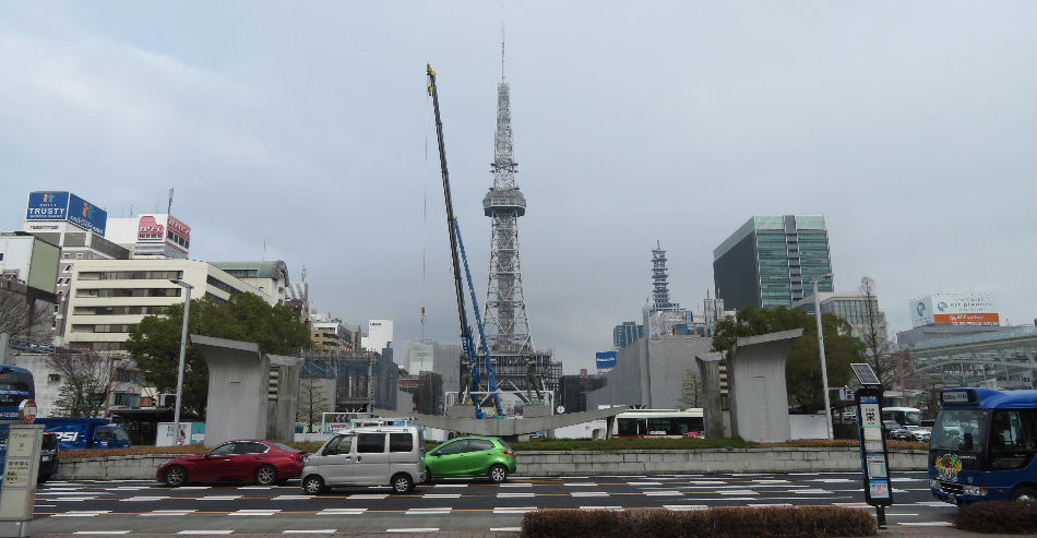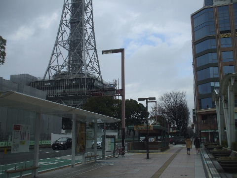 | 10:58錦通から久屋大通北方向を見る。テレビ塔の股間の下を地下鉄名城線が通り、右(東)側の地下に名鉄瀬戸線栄町駅がある。 |