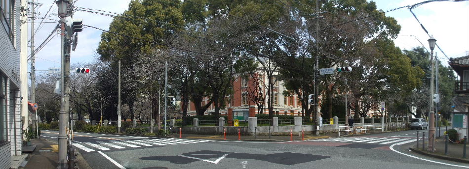 | 11:15外堀南東角の市政資料館南交差点を左折し北へ向かい市政資料館交差点を通過。左建物の裏が外堀、右奥の煉瓦色の建物が市政資料館で元裁判所の建物。 |