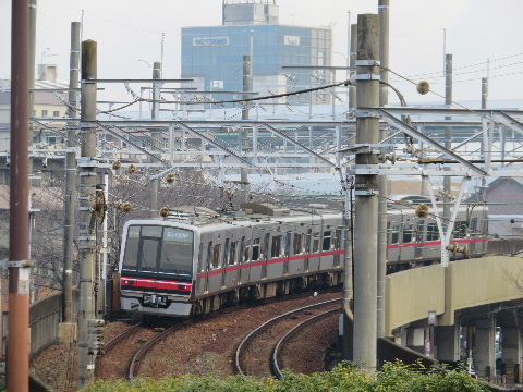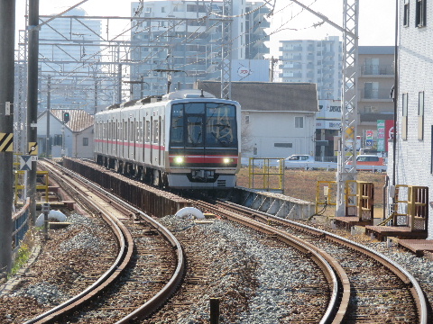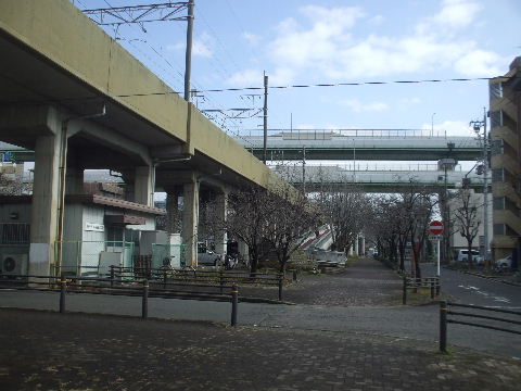 12:43線路に沿って北へ進むと右側を並行しているJR中央線を跨 いで進路を東へ変えるべく高架橋が高くなっていく。 |