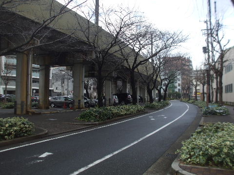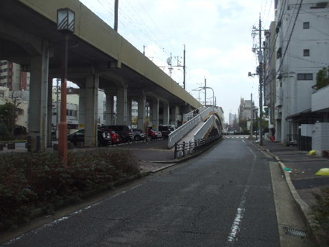 12:47さらに右折してUターンするように進むとすぐ、JR中央線を跨 いで東へカーブした瀬戸線の高架橋がある。 |